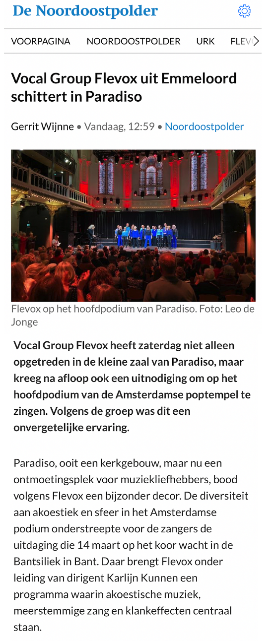 Ook nu werd weer duidelijk dat Flevox met haar grote expressiviteit en muzikaliteit, onder leiding van Karlijn Kunnen, menig toehoorder raakt.